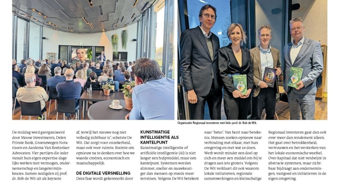 De middag werd georganiseerd door Moose Investments, Delen Private Bank, Groenewegen Notarissen en Aardema van Boetzelaer Advocaten. Vier partijen die ieder vanuit hun eigen expertise dagelijks werken met vermogen, ondernemerschap en langetermijnkeuzes. Samen nodigden zij prof. dr. Bob de Wit uit als keynote speaker emeritus hoogleraar strategisch leiderschap aan Nyenrode Business Universiteit en internationaal erkend denker over maatschappelijke en economische transities.