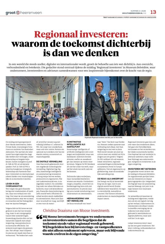 Dat brengt ons bij de herontdekking van de regio. Juist in een digitale wereld wordt fysieke nabijheid weer waardevol. De regio is overzichtelijk, menselijk en concreet. Hier komen investeren, ondernemen en maatschappelijke impact samen.
